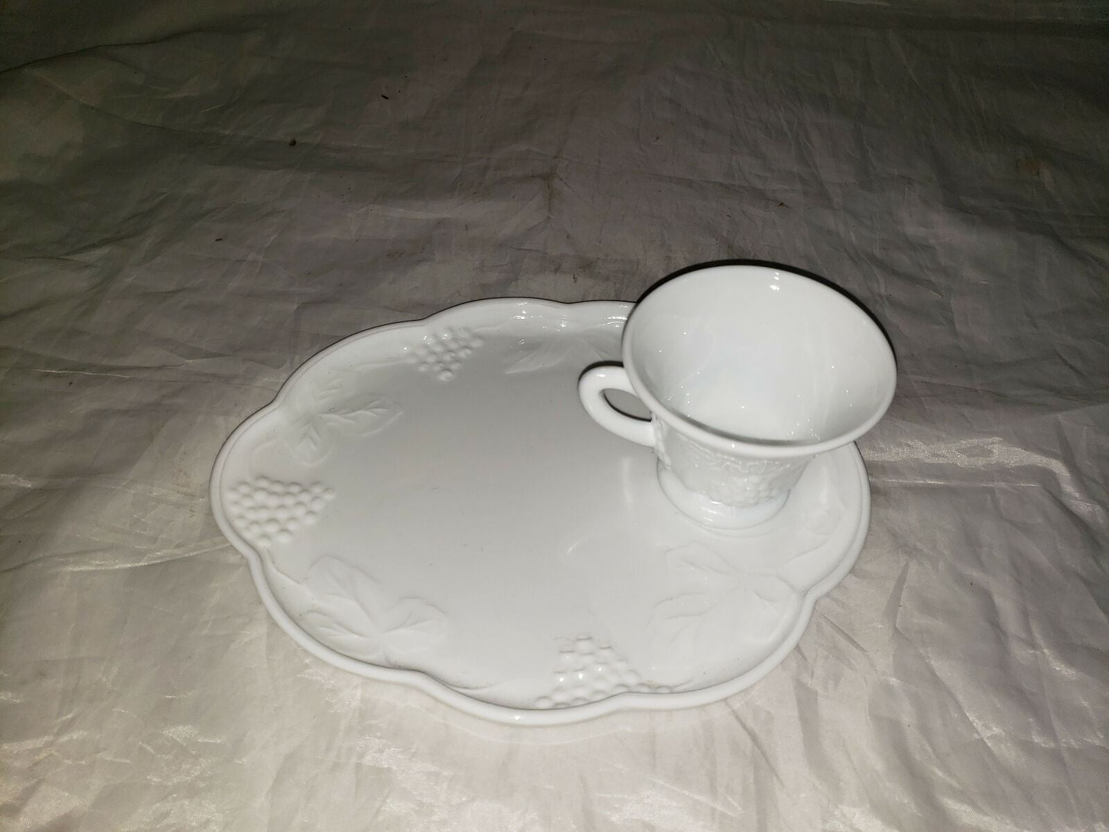 White Milk Glass Snack Luncheon Plate and Cup With Grape Pattern